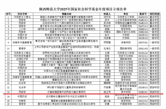 9月29日,全国哲学社会科学工作办公室公布了2025年国家社会科学基金年度项目立项名单。我集团教师程玉萍申报的《汉唐胡俑图像中的民族交融元素研究》荣获西部项目立项。